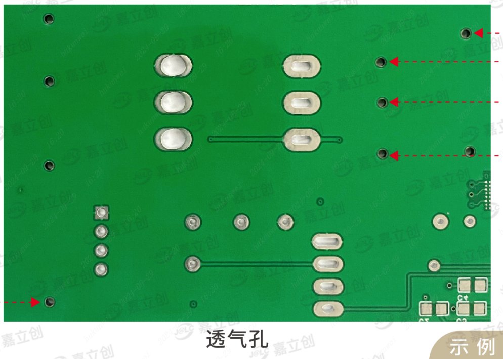 在大面積的銅皮上設(shè)置透氣孔,可以為內(nèi)部氣體提供一個(gè)釋放路徑,從而有效減少起泡問題。透氣孔可以是非金屬化過孔或連接地的金屬化過孔。