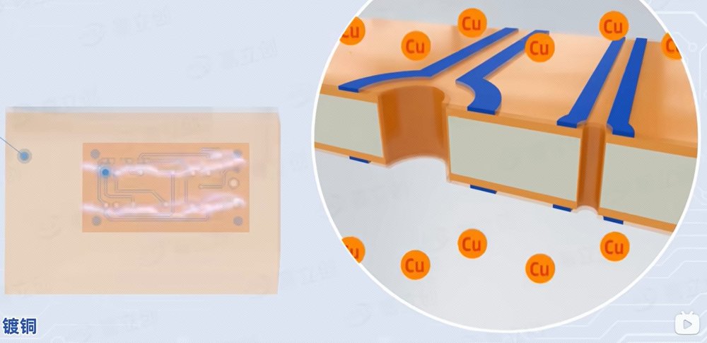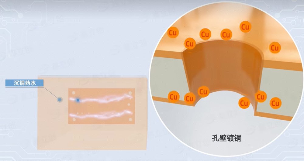在鉆孔之后水洗,進(jìn)入沉銅步驟:板材浸泡在特殊容易中,使孔壁材質(zhì)被活化,更容易吸附銅離子,在孔壁形成一層薄銅。