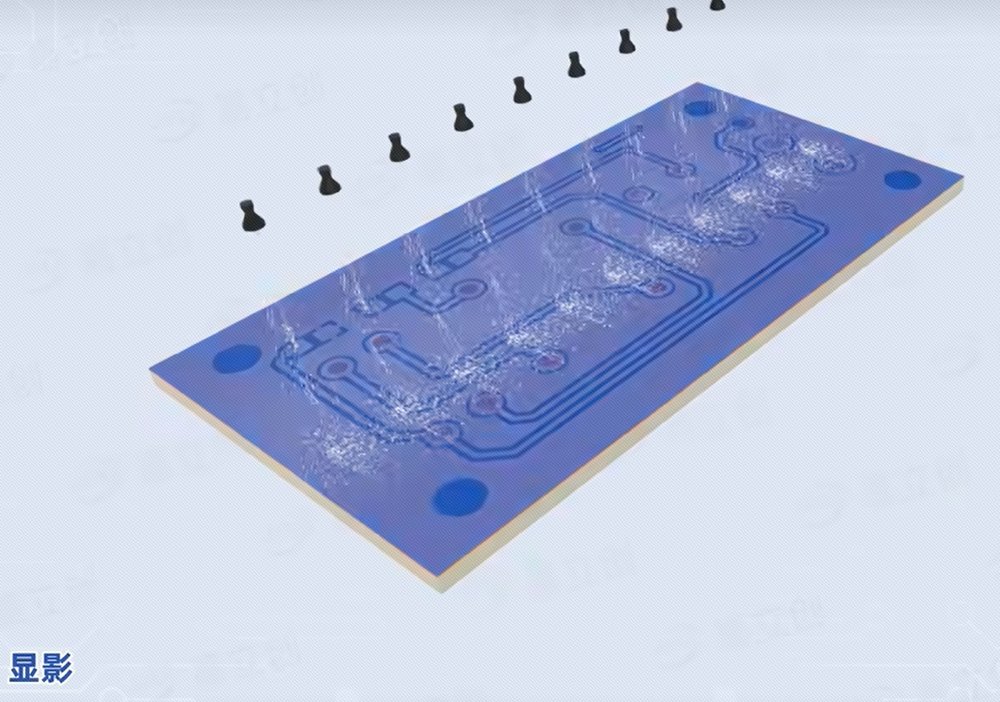 本來暴露的焊點(diǎn)焊盤被絕緣圖層蓋住了,給圖層覆蓋曝光膜,膜上黑色的就是要露出的焊點(diǎn)焊盤(這種工藝叫菲林曝光),現(xiàn)在JLC用的LDI顯影技術(shù)