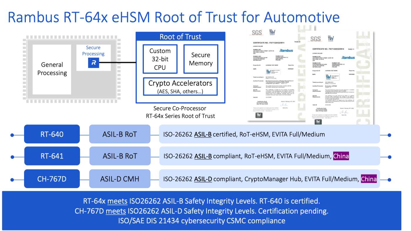 姜新雨特別提到兩個垂直應用領域:人工智能(AI)和汽車行業(yè)。在AI領域,模型、輸入參數和推理結果等資產容易成為黑客攻擊目標,可能導致模型被竊取或推理結果被惡意篡改。Rambus的可信根通過集成到AI加速芯片或主控芯片中,確保計算過程的完整性和保密性。在汽車領域,隨著網聯(lián)車的普及,信息安全與功能安全的重要性日益凸顯。姜新雨介紹了Rambus專為車聯(lián)網開發(fā)的RT-640系列硬件安全模塊(HSM IP),該模塊同時關注功能安全和信息安全,應對聯(lián)網汽車面臨的復雜威脅。