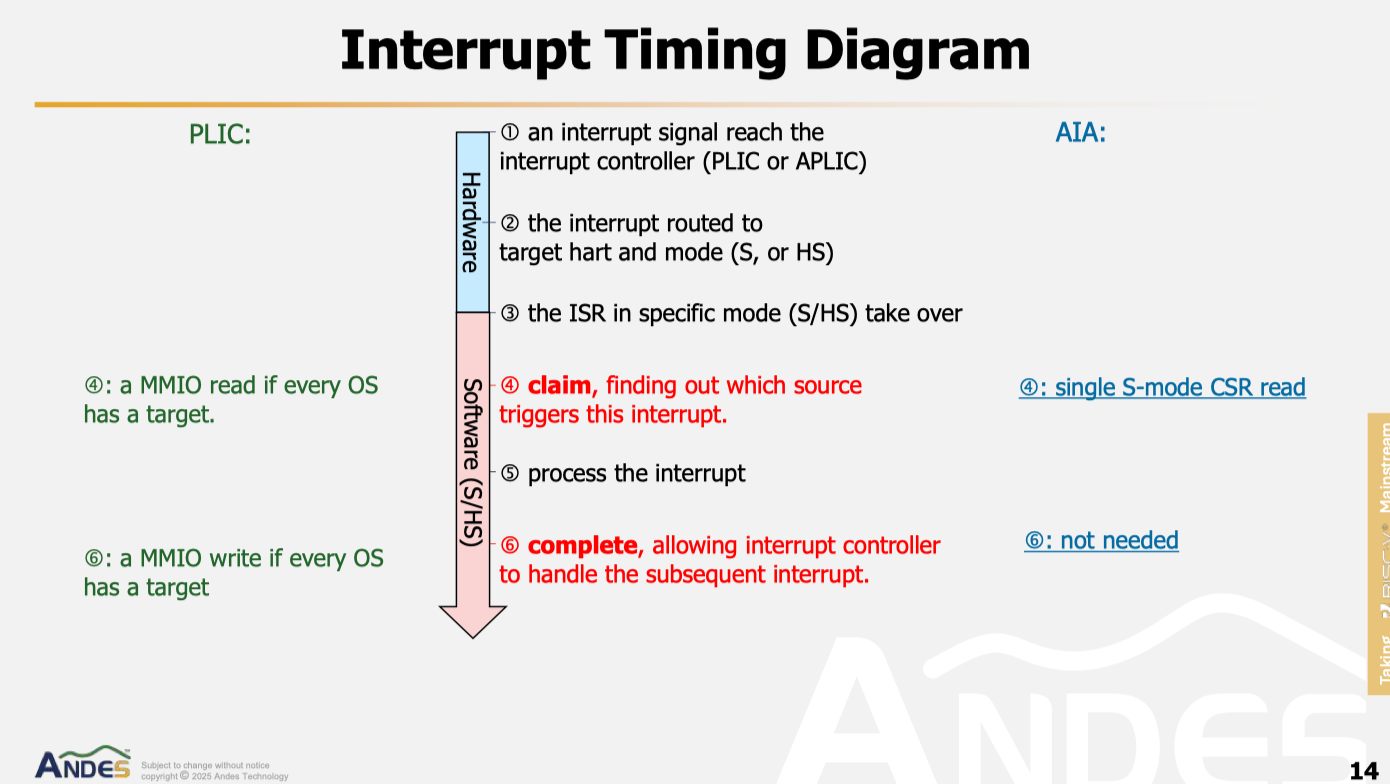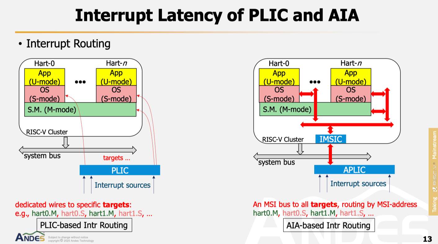 在軟件處理階段,晶心科技對比了基于PLIC(Platform-Level Interrupt Controller)和AIA兩種中斷處理方案的差異。在基于PLIC的平臺中,操作系統(tǒng)需要直接讀取內存映射I/O(MMIO)上的寄存器來完成中斷聲明(claim)動作,這要求配置PMP(Physical Memory Protection)資源以保護系統(tǒng)。如果配置不足,聲明動作需通過虛擬化層完成,進而引入上下文切換的延遲。而在AIA平臺中,設計更具彈性,操作系統(tǒng)通過完成(complete)動作通知中斷控制器后續(xù)中斷可以繼續(xù)發(fā)送至目標核心,且無需額外的上下文切換。這種優(yōu)化進一步提升了中斷處理的效率。