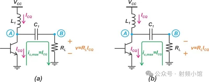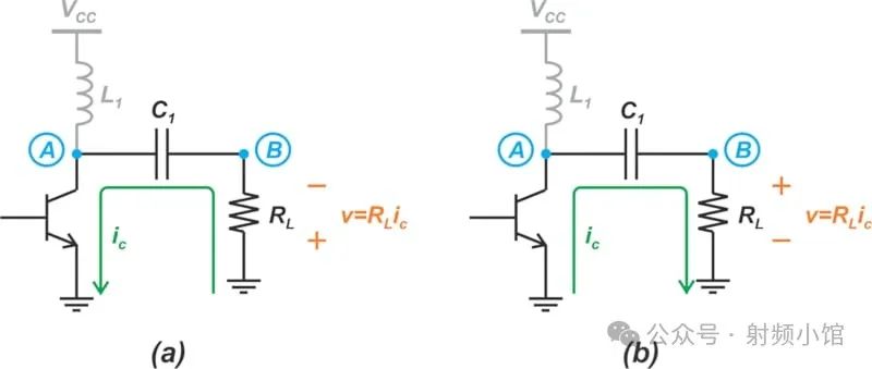 在圖2(a)中,節(jié)點B的交流電壓為–RLic。由于C1作為短路,節(jié)點A的交流電壓也是–RLic。當考慮直流和交流分量時,我們觀察到節(jié)點A的整體電壓從VCC降至一個較小的值VCC – RLic。