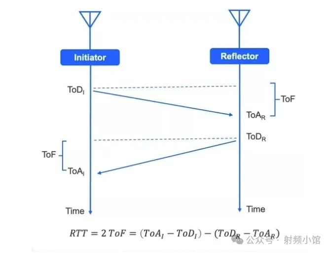 在 RTT 模式下,數(shù)據(jù)包在發(fā)起方和反射器之間發(fā)送。計算這些數(shù)據(jù)包傳輸所需的時間,稱為飛行時間 (TOF)。該 TOF 可用于使用速度公式確定設備之間的距離。