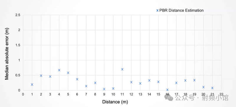 x 軸表示實際距離,y 軸表示中值絕對誤差,每米進行一次測量,最遠可達 21 米。一般來說,觀察到的誤差低于 1 米——考慮到苛刻的多徑環(huán)境,這是一個非常有希望的結果。
