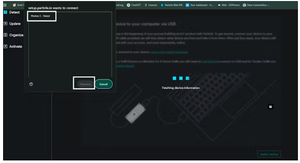 ?然后它將顯示,設(shè)備進入DFU模式,然后彈出窗口將再次選擇您的設(shè)備,從菜單中選擇設(shè)備Photon 2 DFU模式并單擊連接(因為現(xiàn)在它處于DFU模式,它將閃爍黃燈)