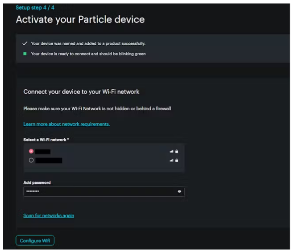 ?然后它將顯示連接你的Photon 2與Wi-Fi網(wǎng)絡(luò),選擇你的網(wǎng)絡(luò),并輸入密碼,點擊配置WiFi