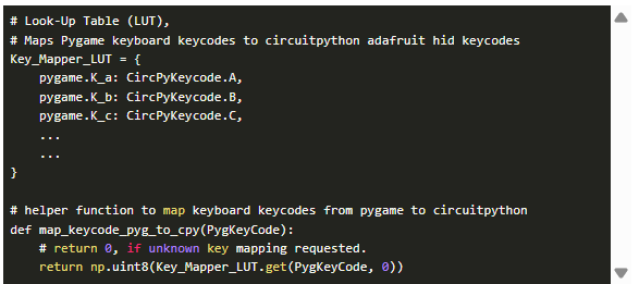 Pygame和circuitpython使用不同的整數(shù)值引用相同的鍵盤鍵或鼠標(biāo)按鈕。例如,pygame使用值0x97引用鍵盤鍵‘A’,而circuitpython使用值0x04引用相同的鍵盤鍵。因此,必須有一個查找表和查找函數(shù)來幫助進(jìn)行鍵和按鈕映射。