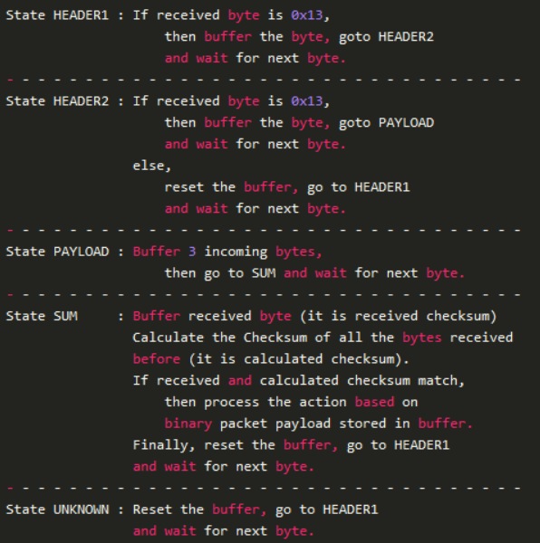 通過向數(shù)組中添加字節(jié)來編碼二進(jìn)制數(shù)據(jù)包更容易,但與編碼相比,解碼有點(diǎn)困難。下面是運(yùn)行在Rpi pico上的狀態(tài)機(jī)對步驟3中描述的二進(jìn)制協(xié)議的解碼邏輯。此狀態(tài)機(jī)已使用if..elseif..實現(xiàn)。Else控制語句與一對狀態(tài)變量。