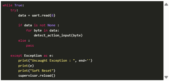 在這種情況下,我們可以編寫包含整個while True的異常處理程序,并從頭開始重新啟動腳本執(zhí)行。因此,用戶甚至不會注意到異常,pico將很快恢復(fù)運(yùn)行。這種方法對我們來說很有效,因為我們的應(yīng)用程序不是安全關(guān)鍵的,因此重新啟動不會導(dǎo)致任何問題。但對于安全關(guān)鍵型、高完整性或硬實時系統(tǒng),這種方法可能有所不同。