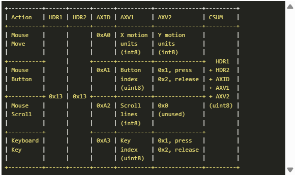 由于我們需要發(fā)送關(guān)于鼠標(biāo)和鍵盤動作的非?;镜男畔?,因此使用以下簡化的二進(jìn)制通信協(xié)議將不同的動作從本地計算機(jī)發(fā)送到Rpi pico。