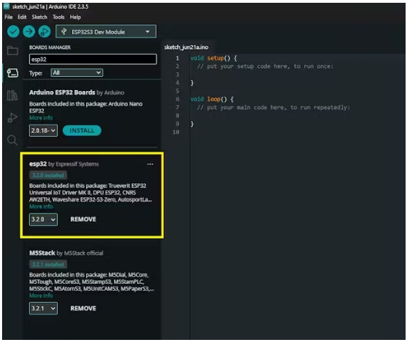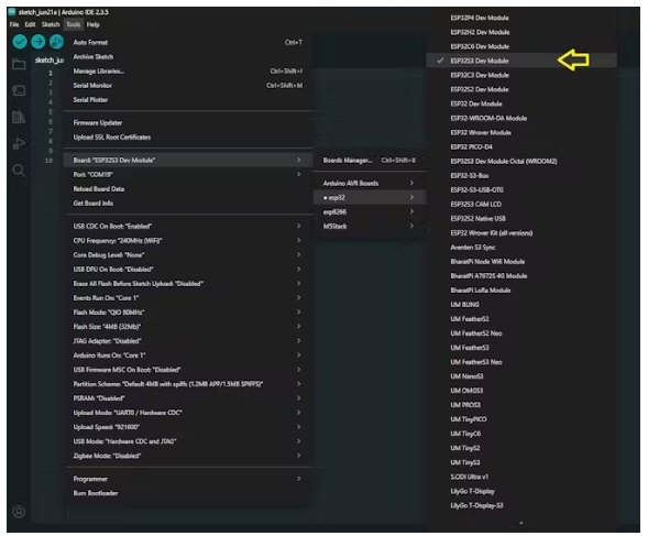 選擇板:安裝后,轉到Tools > Board,導航到ESP32 Arduino部分,并選擇“ESP32S3 Dev Module”(或類似的ESP32- s3板,具有8MB PSRAM,具體取決于特定的軟件包版本和板的確切名稱)。