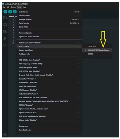 選擇端口:進入Tools > Port,選擇ESP32-S3-AI-Camera對應的COM端口