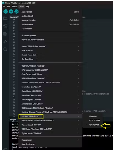 分區(qū)方案:選擇合適的分區(qū)方案,通常包括支持8MB PSRAM的分區(qū)方案(例如,“巨大的應用程序(3MB No OTA/1MB SPIFFS)”或類似的分區(qū)方案,具體取決于確切的固件和示例)。PSRAM配置至關重要,通常需要“OPI PSRAM”模式。您也可以將其保留為默認值。