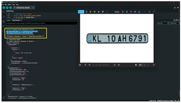 響應(yīng)從JSON中解析,如果提取出有效的車(chē)牌號(hào),代碼將檢測(cè)時(shí)間和車(chē)牌號(hào)記錄到串行監(jiān)視器中。如果啟用了Firebase集成,結(jié)果(車(chē)牌號(hào)碼、時(shí)間戳和圖像)也會(huì)發(fā)送到Firebase實(shí)時(shí)數(shù)據(jù)庫(kù)。這為實(shí)時(shí)車(chē)輛監(jiān)控和記錄創(chuàng)造了一個(gè)緊湊但智能的邊緣人工智能管道。