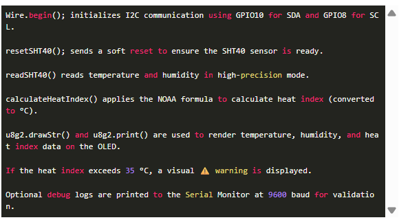 本項目將Carenuity C3-Mini這款超緊湊型Wi-Fi + BLE MCU改造成一個熱指數(shù)監(jiān)視器。通過將SHT40傳感器(用于精確的溫度和濕度)與0.96英寸OLED集成,我們創(chuàng)建了一個微小但功能強大的顯示器,顯示: