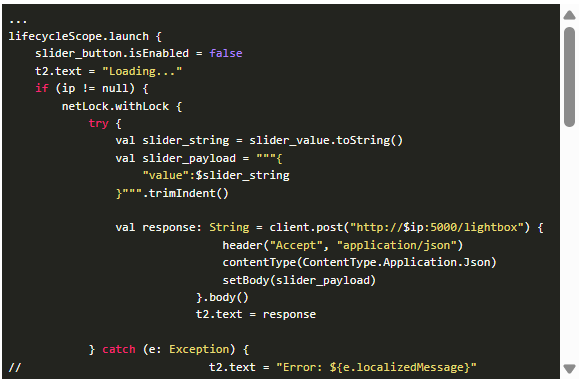 設(shè)置滑塊和按鈕如下。當(dāng)SeekBar改變時(shí),我們將把改變的結(jié)果存儲(chǔ)到一個(gè)滑塊值變量中,當(dāng)我們決定按下負(fù)責(zé)亮度的Apply按鈕時(shí),該變量將用于發(fā)送到電路板。