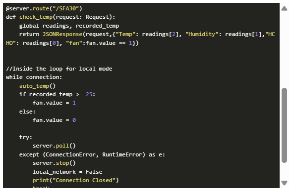 當(dāng)我們決定返回一個(gè)帶有SFA30數(shù)據(jù)和來(lái)自SFA30端點(diǎn)的風(fēng)扇數(shù)據(jù)的JSON對(duì)象時(shí),我們可以簡(jiǎn)單地檢查“fan”鍵的值是真還是假,然后相應(yīng)地更改風(fēng)扇照片。