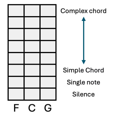 從概念上講,畫一條線連接第二行的中心點和最后面一行中平均間隔4個八度的7個音符的點。每一行演奏的和弦近似于經(jīng)過這些點的線。