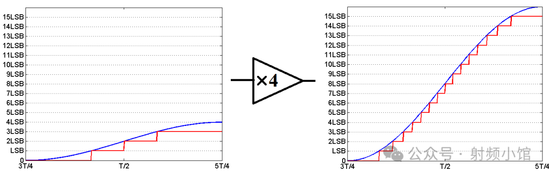 請注意,由于ADC的參考電壓沒有改變,其最低有效位(LSB)仍然是1/8V。如圖2所示,輸入信號的最大值為4LSB,它遠(yuǎn)遠(yuǎn)小于ADC的參考電壓。你可能會說圖2展示了我們ADC的預(yù)期功能,并沒有什么問題。但實際上,這意味著ADC的動態(tài)范圍并沒有得到充分利用。在實際情況中,我們通常希望輸入信號的幅度盡可能接近ADC的參考電壓,以充分利用ADC的動態(tài)范圍。