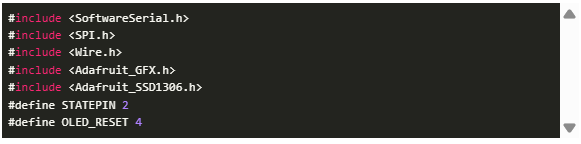 庫包含:包括必要的軟件串行通信(SoftwareSerial), SPI通信(SPI), I2C通信(Wire)和控制OLED顯示器(Adafruit_GFX和Adafruit_SSD1306)的庫。