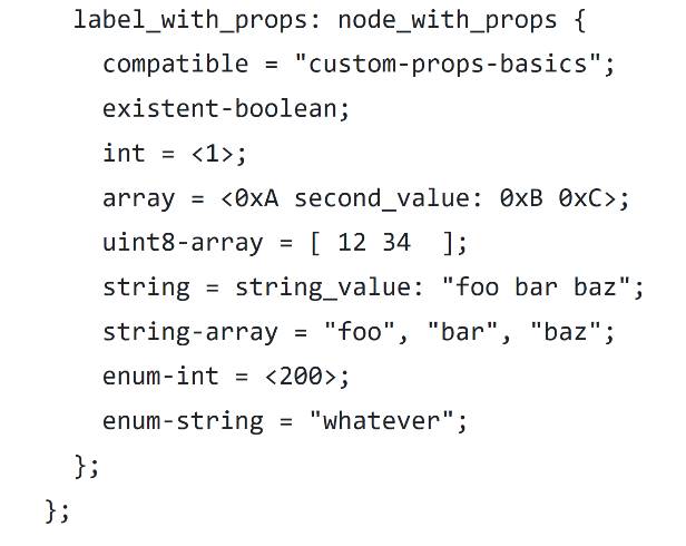 設(shè)備樹節(jié)點(diǎn)中每個(gè)屬性有一個(gè)名稱和一個(gè)值,屬性的值可以是字符串、整型數(shù)、布爾值、8位整型數(shù)組、字符串?dāng)?shù)組、混合類型數(shù)組、指向節(jié)點(diǎn)的phandle (類似C語言中的指針)、復(fù)數(shù)的phandle或是phandle數(shù)組。