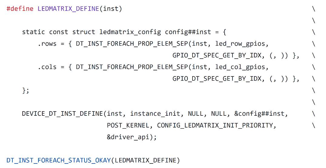 和上一節(jié)提到的傳感器驅(qū)動(dòng)類似,DT_INST_FOREACH_STATUS_OKAY針對每個(gè)狀態(tài)為就緒的、兼容名為“custom-ledmatrix”的設(shè)備進(jìn)行驅(qū)動(dòng)初始化。