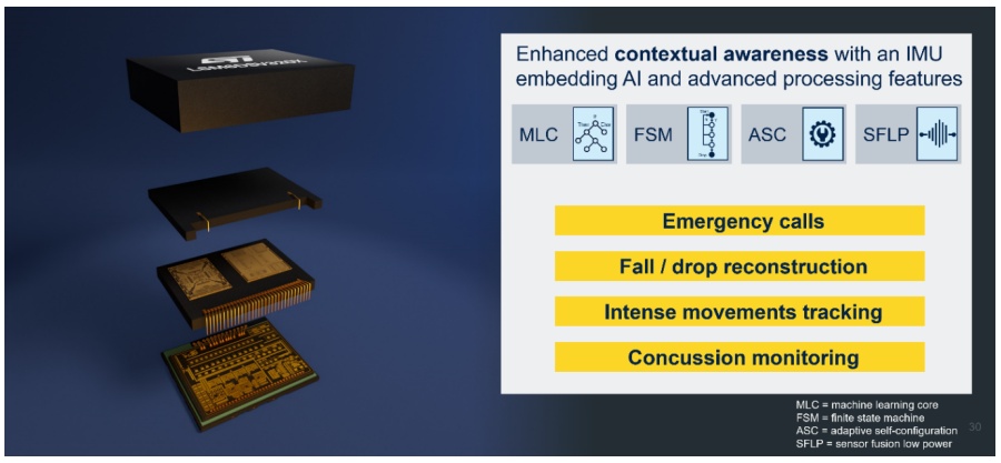 傳統(tǒng)IMU能夠測(cè)量運(yùn)動(dòng)和方位,而新型的 IMU的功能不止于此 ;除了基礎(chǔ)功能,還嵌入了兩個(gè)加速度計(jì):一個(gè)用于測(cè)量日常低強(qiáng)度運(yùn)動(dòng),另一個(gè)用于監(jiān)測(cè)高強(qiáng)度沖擊。這種雙重功能配合人工智能(AI)和先進(jìn)的處理功能,可以實(shí)現(xiàn)無與倫比的情境感知能力。