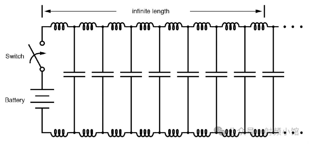 驅(qū)動(dòng)無限傳輸線。盡管在這個(gè)“思維實(shí)驗(yàn)”中我們可以通過使用超導(dǎo)體來避免導(dǎo)線的電阻,但我們無法消除導(dǎo)線長(zhǎng)度上的電容。任何由絕緣介質(zhì)隔開的一對(duì)導(dǎo)體都會(huì)在這些導(dǎo)體之間產(chǎn)生電容:(下圖)