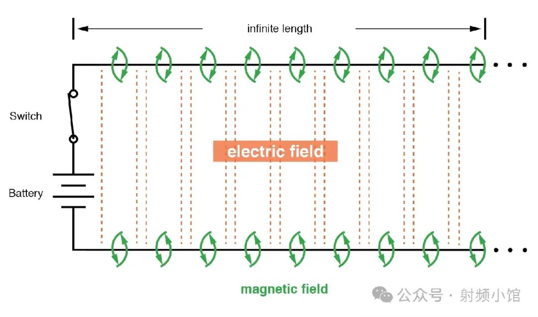 無限長(zhǎng)的平行導(dǎo)線假設(shè)我們有一組無限長(zhǎng)的平行導(dǎo)線,末端沒有燈泡。當(dāng)我們閉合開關(guān)時(shí)會(huì)發(fā)生什么?由于導(dǎo)線的末端不再有負(fù)載,這個(gè)電路是開路的。難道電路中一點(diǎn)電流都沒有嗎?(如圖)