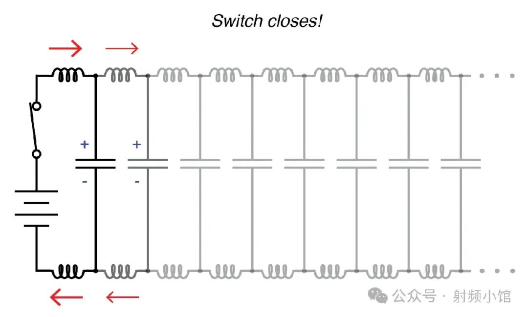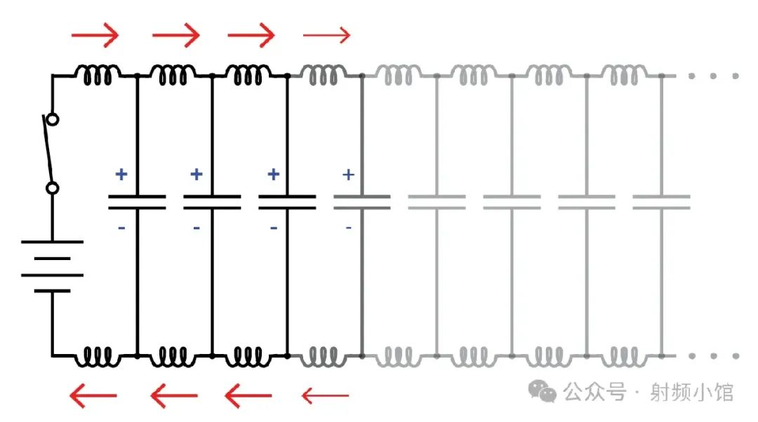 電壓充電電容,電流充電電感。由于兩根導(dǎo)線中的電荷載體以接近光速的速度相互傳遞運(yùn)動(dòng),電壓和電流變化的“波前”將以相同的速度沿導(dǎo)線長(zhǎng)度傳播,導(dǎo)致分布電容和電感分別逐漸充電至全電壓和電流,如下所示:
