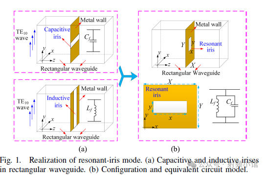 在矩形波導中,沿x軸方向的孔徑可以視為并聯(lián)電容負載,因為它顯著影響了電場,并在局部產生存儲的電能;而沿y軸方向的孔徑則被視為并聯(lián)電感負載,因為其提供了額外的電流路徑,導致孔徑內出現(xiàn)新的縱向磁場并增加局部存儲的磁能。因此,如果孔徑的長度(沿x軸)和寬度(沿y軸)都小于矩形波導的邊長,這個孔徑就可以看作一個并聯(lián)LC諧振電路。