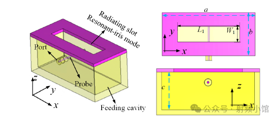 諧振孔模式已被用于設計與腔體模式合作的寬帶增強槽天線。然而,由于同時利用了腔體模式,它們的帶寬被限制在20%以內。本文的研究重點是僅利用諧振孔模式的天線設計,旨在實現(xiàn)具有更寬濾波帶寬的新型槽天線。下圖展示了基于諧振孔模式的CBSA配置。帶有金屬腔背襯的輻射槽可以產生諧振孔模式。由于槽的一側向自由空間開放,該槽也作為輻射槽來輻射諧振孔模式的能量。