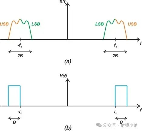 圖3. DSB信號(hào)的頻譜(a)以及用于生成上邊帶SSB信號(hào)的理想濾波器響應(yīng)(b)。