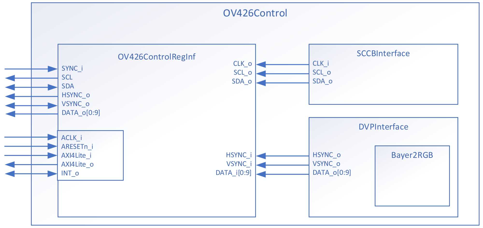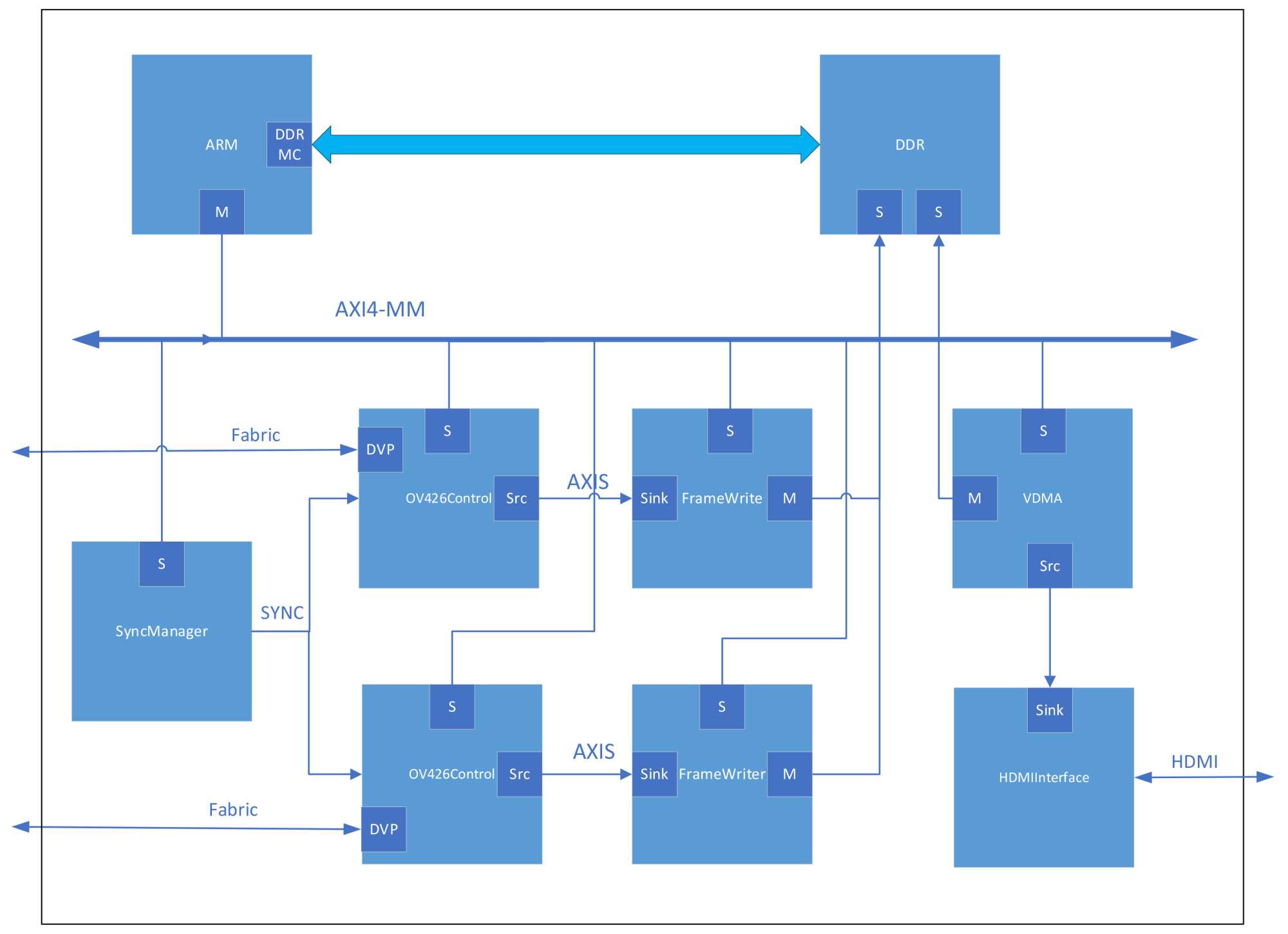 FPGA內(nèi)部實(shí)現(xiàn)兩個(gè)OV426模塊,通過(guò)10位DVP接口分別與兩個(gè)OV426模塊連接,傳輸實(shí)時(shí)圖像。模塊內(nèi)SCCB模塊,用于初始化和在線修改CMOS的配置,比如白平衡、開窗大小等參數(shù)。系統(tǒng)異常通過(guò)中斷引腳INT_o向ARM匯報(bào)。