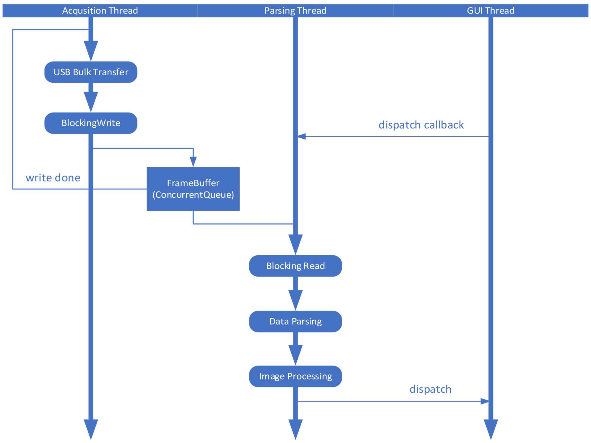 為了減少圖像顯示的延時(shí),提高系統(tǒng)的實(shí)時(shí)性能,圖像的采集、處理和顯示采用多線程異步的架構(gòu),數(shù)據(jù)通過(guò)線程安全的環(huán)形隊(duì)列ConcurrentQueue緩沖,采用生產(chǎn)–消費(fèi)者模式,數(shù)據(jù)采集線程作為生產(chǎn)者,將采集到的圖像放入緩沖隊(duì)列,并工作在最高優(yōu)先級(jí),以保證幀的完整性,達(dá)到系統(tǒng)最大的可靠性。圖像處理線程作為消費(fèi)者,從緩沖隊(duì)列讀取圖像幀,并處理后dispatch到GUI線程,這樣可以保證用戶界面的流暢性。