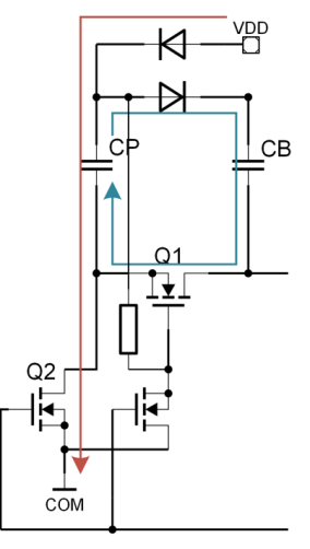 如紅線所示,當(dāng)Q2導(dǎo)通時,電容器(CP)由VDD充電并儲存能量。隨后,Q2關(guān)閉,Q1導(dǎo)通,CP放電并將其儲存的能量轉(zhuǎn)移到CB。CP和CB上的電壓可以通過方程進行檢測。