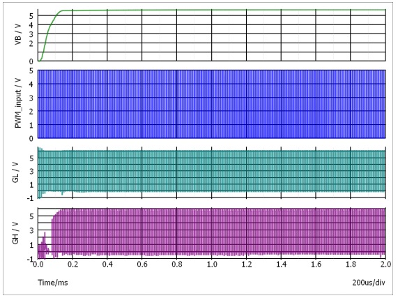 圖4顯示了仿真電路和詳細(xì)波形。VB用作高邊驅(qū)動器的電源,設(shè)計用于驅(qū)動?xùn)艠O電壓為5 V的GaN晶體管。UVLO配置為在4.5 V時觸發(fā),具有0.5 V的滯后范圍。GL和GH分別代表高邊和低邊推挽驅(qū)動器的輸出,在驅(qū)動晶體管的正確電壓水平下實現(xiàn)對稱開關(guān)。
