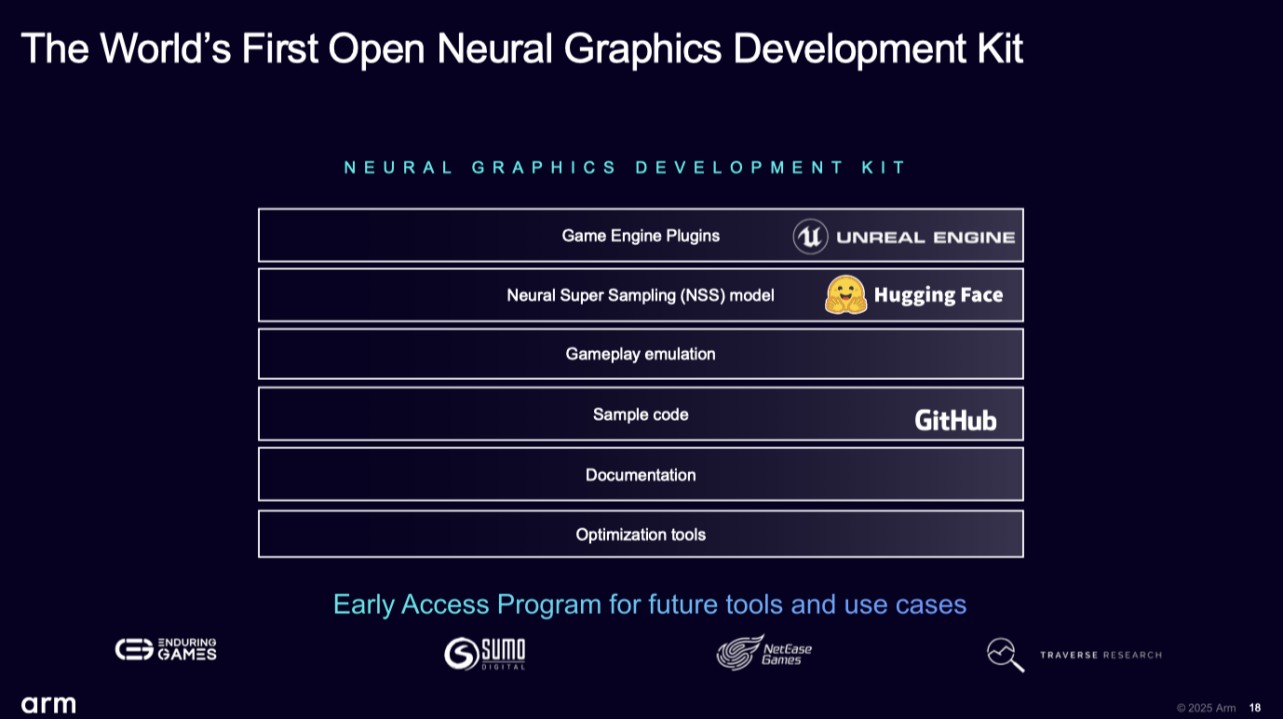 與桌面端和主機(jī)端的神經(jīng)技術(shù)的提供方式不同,Arm 的所有神經(jīng)技術(shù)都將全面開(kāi)放,這意味著游戲工作室重新訓(xùn)練模型所需的模型架構(gòu)、權(quán)重以及工具,全部可供使用。“Arm這樣做,不僅因?yàn)橘x能生態(tài)系統(tǒng)是其 DNA,我們還相信不同游戲有不同需求,只有通過(guò)全面開(kāi)放,開(kāi)發(fā)者才能針對(duì)其獨(dú)特工作負(fù)載進(jìn)行適配優(yōu)化。”Steve Steele分享到,“Arm 不僅會(huì)全力優(yōu)化此次發(fā)布的所有技術(shù)的開(kāi)箱即用體驗(yàn),同時(shí)也為開(kāi)發(fā)者保留了底層的完整控制,那些希望進(jìn)一步調(diào)優(yōu)的開(kāi)發(fā)者,盡可放手去嘗試?!?