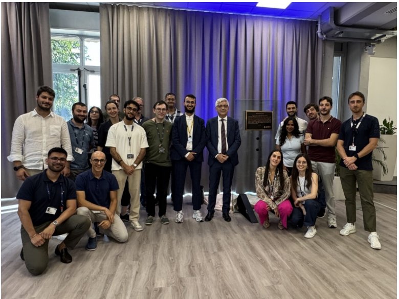 Alessandro Cremonesi(ST 首席創(chuàng)新官)與年輕的 ST 員工一起站在 IEEE獎牌旁