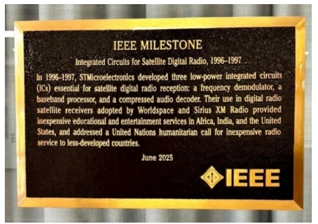 2025年6月,意法半導(dǎo)體憑借其革命性的衛(wèi)星數(shù)字廣播芯片組榮獲第三座IEEE里程碑獎牌。該獎項旨在表彰獲獎?wù)咴谕苿訑?shù)字衛(wèi)星廣播商業(yè)化及提升人類社會福祉方面所做出的卓越貢獻(xiàn)。此前,意法半導(dǎo)體已因BCD硅工藝(2021)和MPEG視頻解碼器(2023)兩度獲此殊榮。