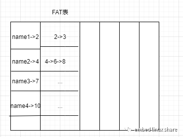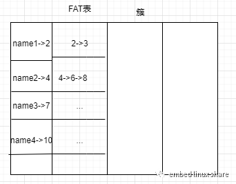 現(xiàn)在每個扇區(qū)的頭部還有一個專門的字段來記錄扇區(qū)所屬文件以及下一個扇區(qū)的地址,這個字段我們也把它剝離出來集中管理,像文件索引表一樣,也用一些扇區(qū)來保存,這樣子會顯得整個文件系統(tǒng),架構(gòu)更加的清晰,管理更加方便。這些用來保扇區(qū)關(guān)系的扇區(qū),在fatfs里面就叫做FAT(File Allocation Table)表,如下圖: