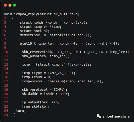 第8行:判斷icmp的報(bào)文類(lèi)型,如果是查詢(xún)報(bào)文,則調(diào)用icmpv4_reply()函數(shù)