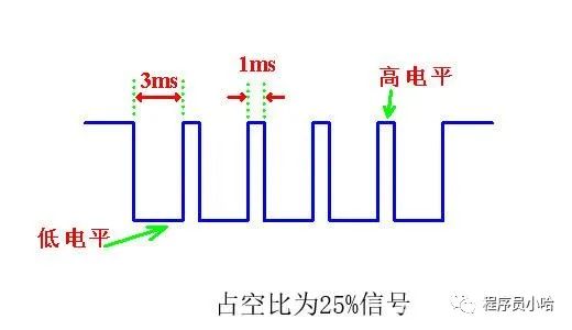 占空比就是指在一個周期內(nèi), 信號處于高電平的時間占據(jù)整個信號周期的百分比, 例如上圖中所示脈沖的占空比就是25%。