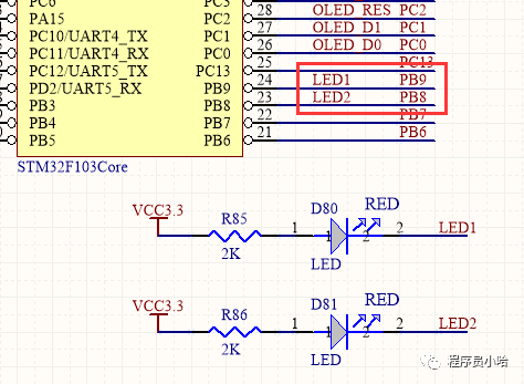 由上面的原理圖可知,當LED1和LED2引腳為高電平的時候,LED滅;當引腳為低電平的時候,LED亮。