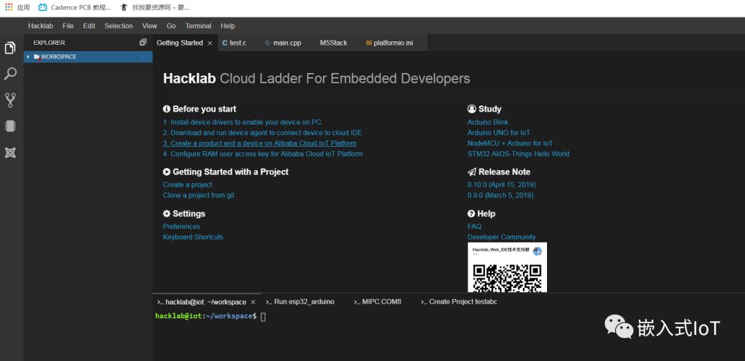 由于esp32用的是串口進(jìn)行下載,所以需要一個(gè)串口代理,將串口設(shè)備轉(zhuǎn)移到遠(yuǎn)程WebIDE上。阿里云的Hacklab就提供了這樣一個(gè)工具。