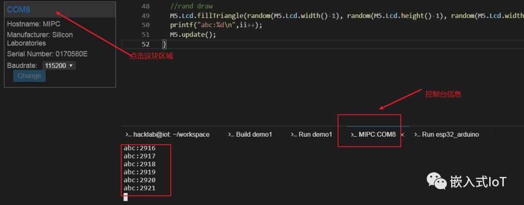 此時(shí),可以看到串口打印信息,同時(shí),也可以看到M5Stack上顯示圖形畫(huà)面。