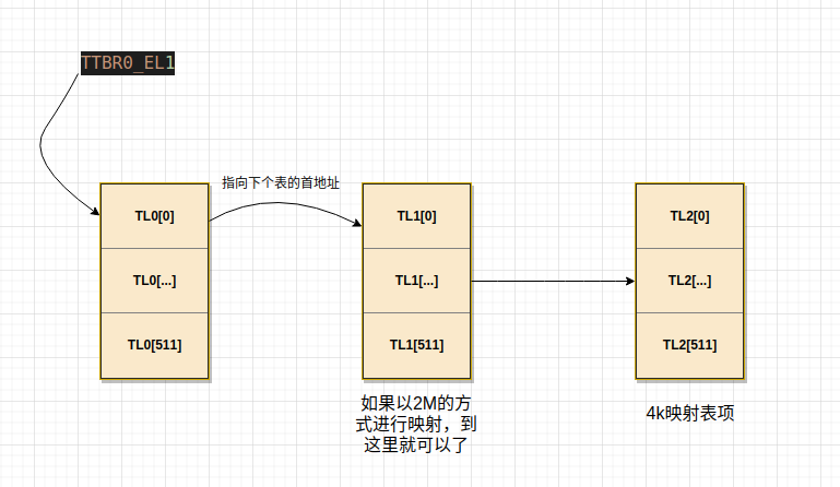 這里由于用不到0x4000 0000以上的空間,所以把這部分空間再進(jìn)行第二次映射。直接指向了T0_L1表的地址。