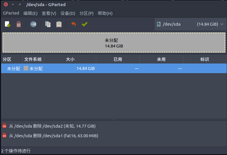 這里推薦一個(gè)格式化工具gparted。利用這個(gè)工具將SD卡格式化成未分配的即可。