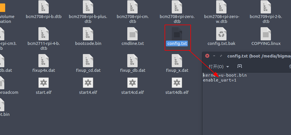 將編譯好的u-boot.bin放到sd卡中,然后修改樹(shù)莓派的啟動(dòng)文件