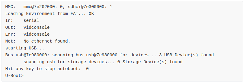 按上面的方法做好SD卡后,插入樹(shù)莓派3B,通電可以在串口上看到如下所示的輸出信息: